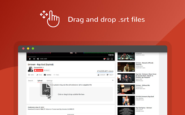 此扩展程序可让您为在 YouTube 上观看的任何视频添加字幕。只需将电影的 .SRT 文件或压缩的 .SRT 文件拖放到上传框,字幕就会开始显示。