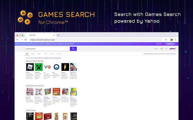 1. 将默认搜索设置更改为我们的域 games-search.net,由 Yahoo 提供支持。我们需要此权限才能在自动完成中提供快速访问。在这个扩展中,我们还支持 Google 和 Bing。如果您想选择不同的选项,您可以转到扩展设置并进行更改。