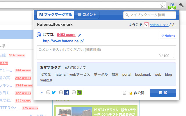 这是 Hatena 的官方扩展,可以更方便地在 Google Chrome 上使用。