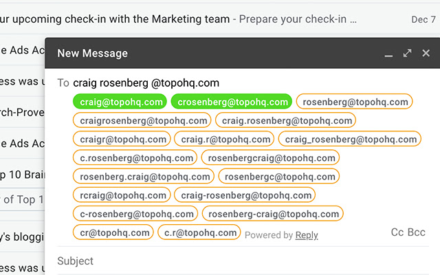 要免费查找任何人的电子邮件,只需在 Gmail Composer 选项卡的“收件人:”字段中输入人名、姓氏和公司域名,Name2Email 将自动建议正确的电子邮件地址。