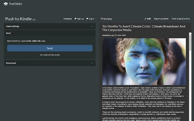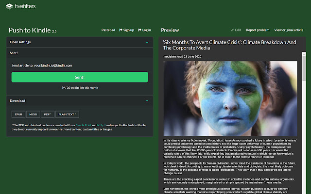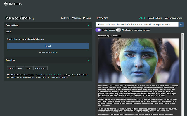 Push to Kindle 让您可以将网络文章(新闻报道、博客文章)发送到您的 Kindle 或 Pocketbook 以便于阅读。它还提供 EPUB、可打印的 PDF 和纯文本下载。