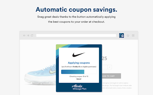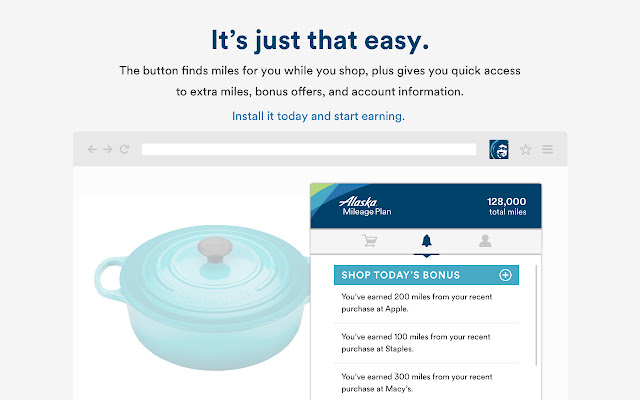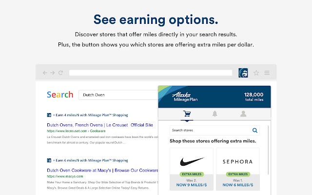 在线购物,再也不会错过航空公司奖励。安装 Alaska Airlines Mileage Plan™ 购物浏览器扩展程序,以利用在线购物的好处并一键直接从 850 多个商店站点激活里程。
