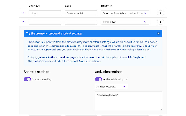 您还可以将每个快捷方式的站点列入黑名单或白名单,以选择您不想在哪些站点上激活哪些快捷方式。