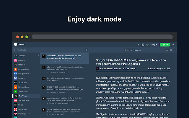 Panda 是一款新闻阅读器,通过结合来自 Hacker News 和 Product Hunt 等网站的顶级故事,让您获得灵感和了解情况。