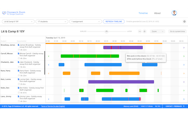 Classwork Zoom 从修订历史中获取这些多种信息,并在时间轴中将它们可视化,使其更快、更容易理解并实际用于决策中,从而使您的课程受益。不只是针对单个文档——同时针对整个班级!只需选择您要添加的作业,您就可以看到所有可视化的工作,包括评论、建议和可能已粘贴的文本的悬停预览。