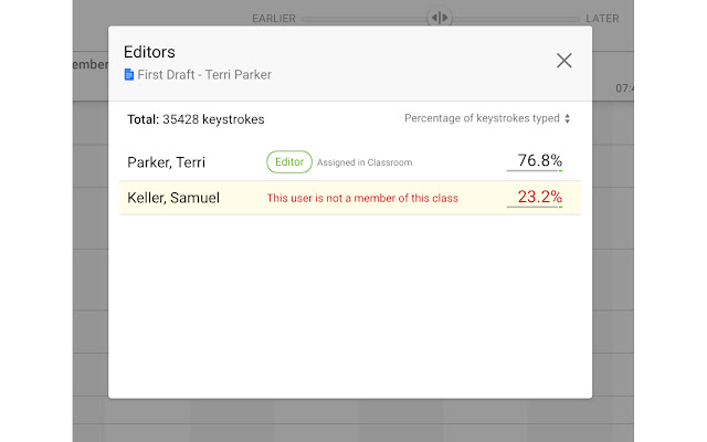- 您不会相信提取共享文档的每个编辑者贡献的击键百分比的细分或查看每个编辑器花费的编辑时间的细分是多么容易(因为并非所有有价值的贡献可以通过击键来衡量)。