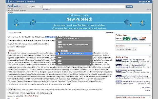 Or you can select doi text then right click>get by doi, then chrome will open a new tab to find resource in sci-hub.