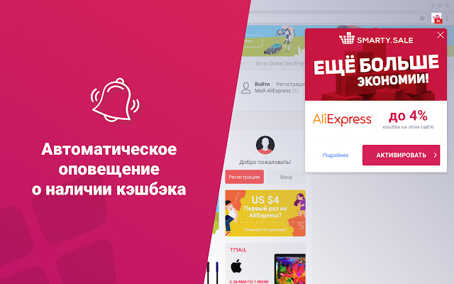 安装 Smarty.Sale 扩展程序后,您会在右上角看到一个带有我们徽标的图标,点击它,您可以在服务中注册或登录,以便计算返现。