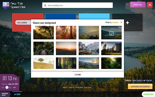 这个免费的 Chrome 浏览器插件可让您快速轻松地导航到您的自定义书签。在 Chrome 浏览器默认的新标签页中设置由 Unsplash 提供支持的图片库的背景。我们实际上是在更改您的 Chrome 浏览器默认的新标签页。也作为附加功能;创建书签组,将书签放入组,设置显示的书签数量,重置设置,并通过 Bing 搜索搜索信息、图像、视频等。新标签中还有一个数字时钟,您可以在其中以 12 或 24 小时格式查看您的时间。