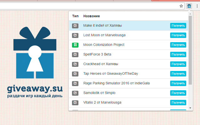 每天 GiveAway.su 为您准备大量新游戏赠品。要获得游戏,您必须完成小赞助商的任务(进入社交群或为某事投票)。此扩展程序“GiveAway.su Checker”可让您检查任务状态并获取游戏!
