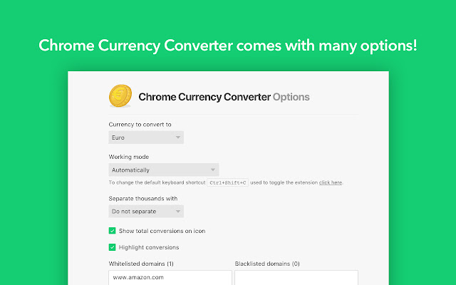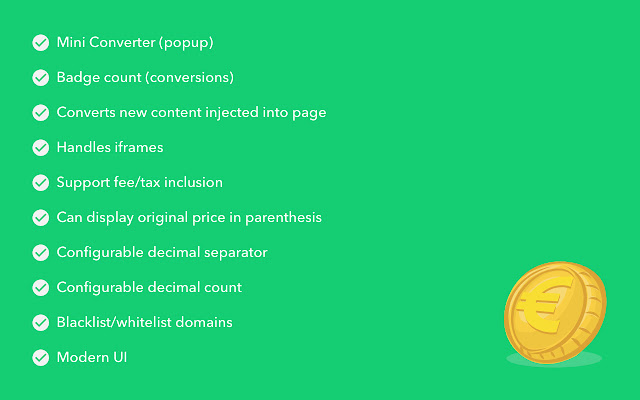 此扩展程序将自动(或不)将任何页面上的价格(从主要货币)转换为所选货币。