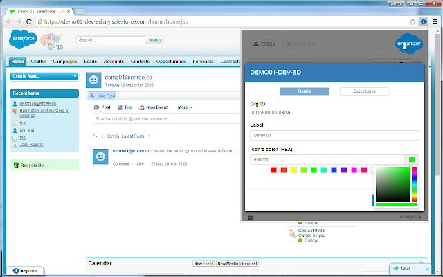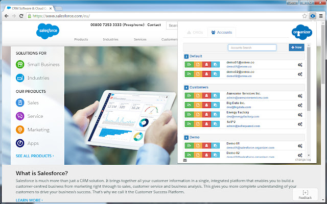 ORGanizer Chrome 扩展程序 (BETA) 可让您忘记 Salesforce.com® 用户名和密码,并帮助您识别浏览器上的 Salesforce.com® 选项卡。