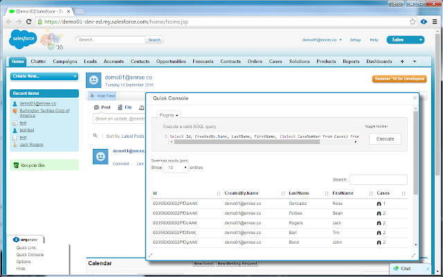 - 使用 Salesforce 选项卡内的快速控制台可以快速访问描述经理、查询、执行匿名和其他方便的工具