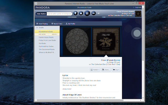 Pandora Player 提供了一个快捷方式,可以在一个新的无边框窗口中打开 Pandora 网站,如屏幕截图所示。它简单、简约且快速。