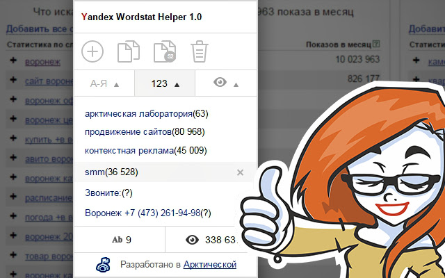 该扩展程序是添加到 wordstat.yandex.ru 服务页面的小部件。