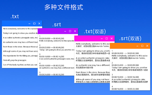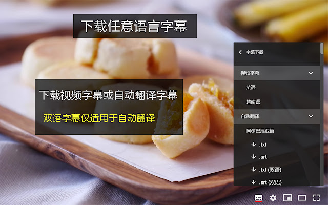 下载视频字幕和自动翻译字幕,提供4种文件格式,.txt、.srt、.txt(双语)、.srt(双语)。