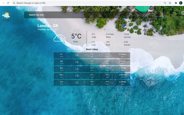 我的天气是一个免费的新标签扩展,可让您即时查看您所在城市的 5 天天气预报;以及可自定义的网络搜索栏,让您轻松地在互联网上查找内容!该扩展程序具有易于使用的界面,仅以摄氏度或华氏度显示您所在位置的天气、日出和日落时间以及风速,而 Bing.com 将成为您在线浏览的默认搜索引擎。