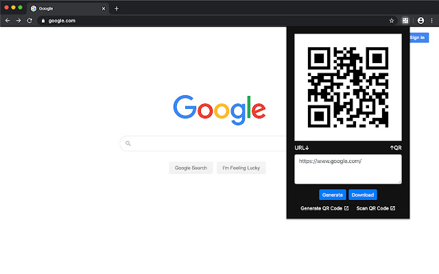 2. 点击扩展图标会自动生成当前页面网址的 QR 码,方便在手机上扫描查看。也可修改输入,生成并下载 QR 码。另外还有两个进入生成和识别 QR 码页面的按钮。