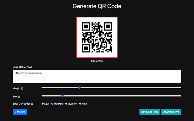 3. 在独立的 QR 码生成页面中,可以设置 QR 码的边缘大小、整体大小和纠错级别,并支持 png 或 svg 格式下载,以及复制到剪切板。