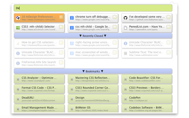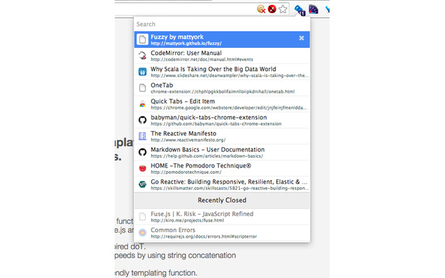 Quick Tabs 是 Google Chrome 网络浏览器的标签管理浏览器扩展,基于 Jetbrains 出色的 IntelliJ IDEA 中内置的“最近的文件”快速选择器。