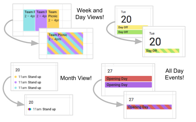 使用 Google Calendar™ 时,您可能在多个日历上有一个事件。例如,在您的工作和个人日历、您的工作日历和您团队的共享日历上,或在许多同事的日历上。这些会弄乱您的日历并使其难以阅读。此扩展程序将所有这些单独的事件合并为一个事件,并为其提供带有所有单个日历颜色的条带。