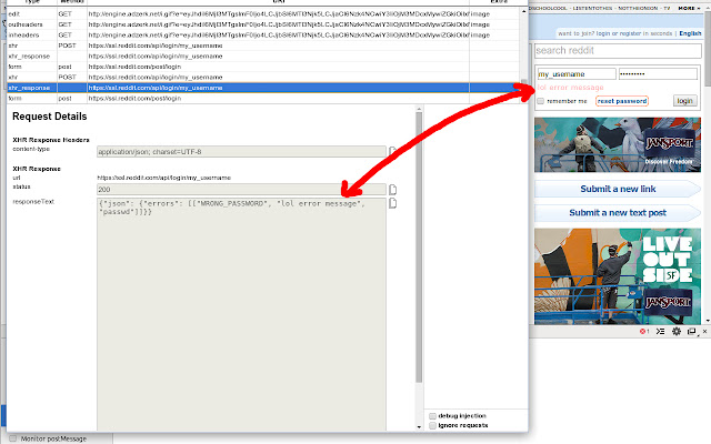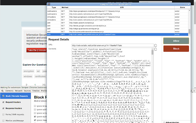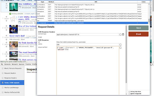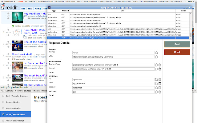 Tamper Chrome 允许您监控浏览器发送的请求和响应。您还可以在请求发出时对其进行修改,并在一定程度上修改响应(标头、css、javascript 或 XMLHttpRequest responseText)。