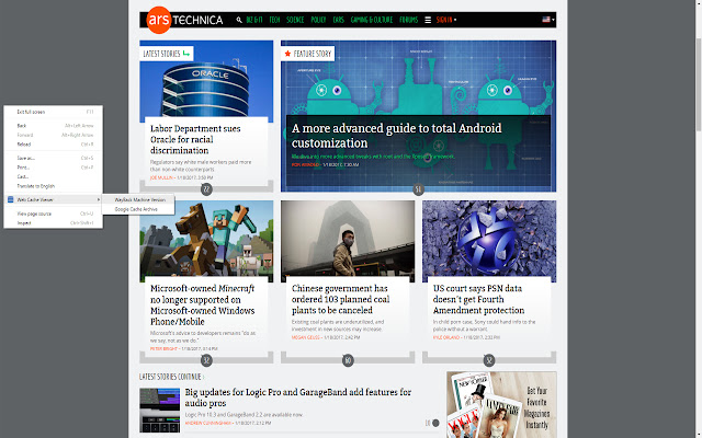 Web Cache Viewer 可让您右键单击任何链接或页面以查看该页面的 Wayback Machine 或 Google Cache 版本。