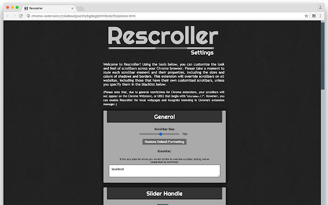 Rescroller 允许您自定义 Google Chrome 中网页滚动条的外观和感觉。使用包含的设置,设置每个滚动条元素的颜色、阴影、边框等,或者编写自定义 CSS 来手动设置滚动条的样式。