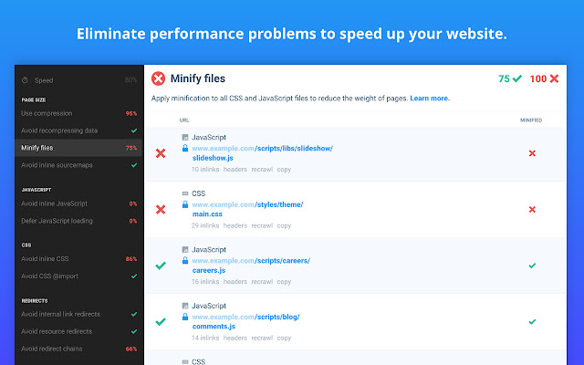 ? 页面速度测试:缩小、网络压缩、资源缓存、渲染阻塞或重复 CSS/JavaScript、过度内联 CSS/JavaScript、重定向 URL 和重定向链。