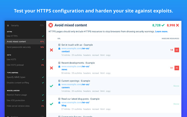 ? 网络安全测试:安全标头、HTTPS 和混合内容检查器、带有 ploading、内容嗅探、iframe 限制和密码表单安全性的 HSTS。