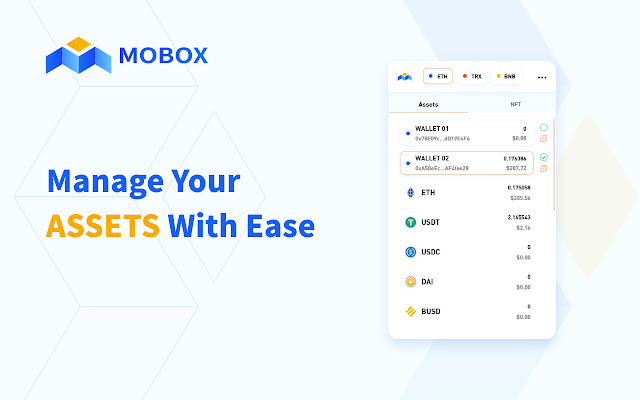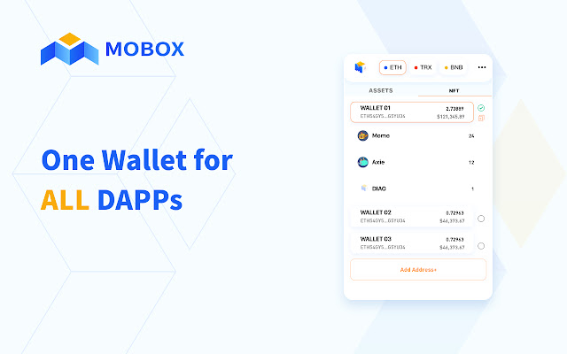 MOBOX 插件钱包是有史以来第一个专为与 Dapp 交互而设计的多区块链去中心化钱包。钱包支持 TRON、ETH 和 BSC 区块链。