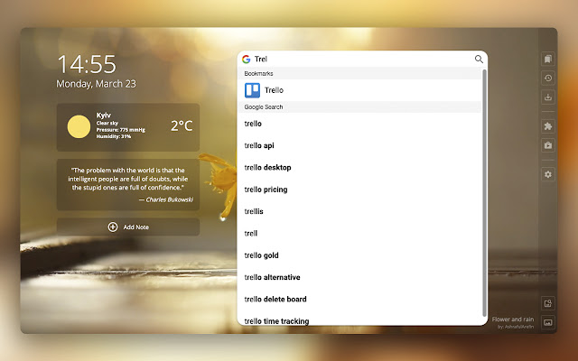 您所要做的只是打开计算机,然后Homey: Productivity Start Page 将确保舒缓的动态壁纸在一侧提供有关天气和注释的信息,而在另一侧提供所有书签的信息,欢迎您的到来。