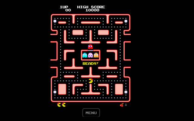 您需要在包含各种点的迷宫中导航 Pacman,而四个多色鬼魂:Blinky、Pinky、Inky 和 Clyde - 尝试找到您。游戏的目标是通过吃掉迷宫中的所有点来积累积分,完成游戏的“阶段”并开始下一个阶段和 Pac-dots 迷宫。在某些阶段之间,播放三个中场动画之一。四个鬼魂在迷宫中漫游,为你打猎。如果其中任何一个鬼碰到你,你就会失去一条生命;当所有的生命都消失了,游戏就结束了。玩家将获得 10,000 的单个奖励生命。生命数可以设置为仅 1 条生命或最多 5 条生命。