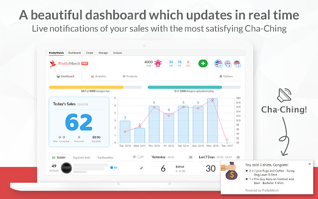 亚马逊 Merch 的漂亮仪表板。它会随着您的销售而更新,并通过 cha-ching 声音立即通知您新的销售情况