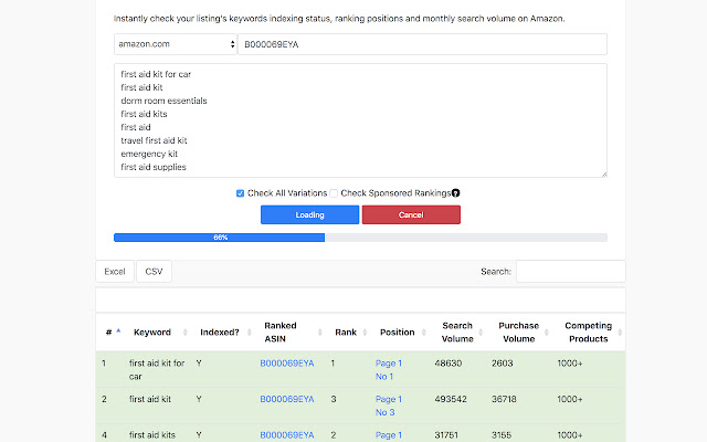 在几秒钟内免费批量检查所有亚马逊“商家词”和“后端关键字”的索引和排名位置!。发现亚马逊认为哪些搜索词不相关。根据亚马逊上的相关性、排名和精确搜索量,为您的列表找到最佳关键字!