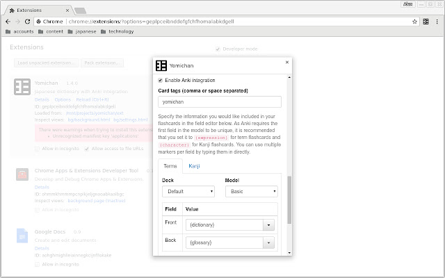Yomichan 通过帮助您破译文本,将您的浏览器变成一个建立日语读写能力的工具,否则这些文本将很难解决。它具有强大的字典,支持 EPWING 和抽认卡创建。