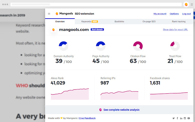 通过 Mangools 的 SEO 扩展加速您的 SEO 程序。单击即可查看重要指标和网站见解。
