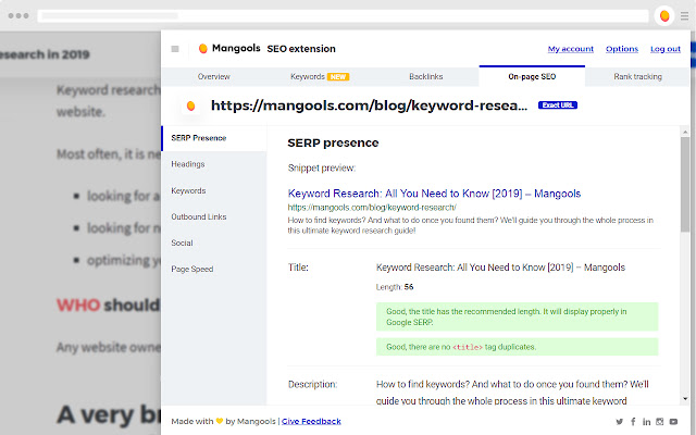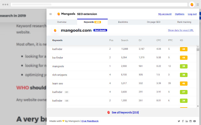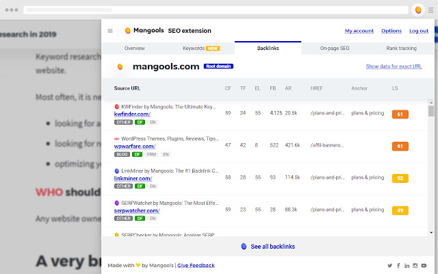 您可以将此扩展程序与 10 天免费试用帐户一起使用。没有附加条件,不需要信用卡。如果您已经订阅了 Mangools SEO 工具,您将在扩展中看到工具中的数据;)