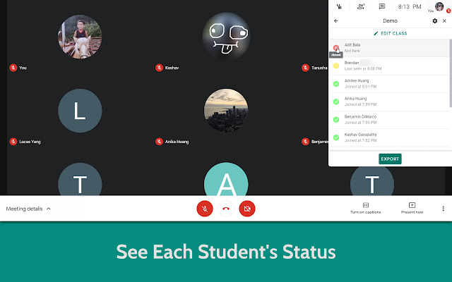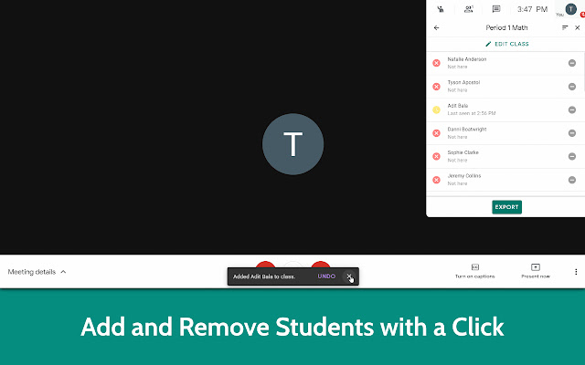 - 使用直观的符号发送学生列表,显示他们是否已离开、缺席、先前已离开但离开(例如,由于技术困难)或已离开但不在您的出席名单上