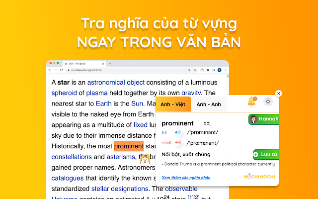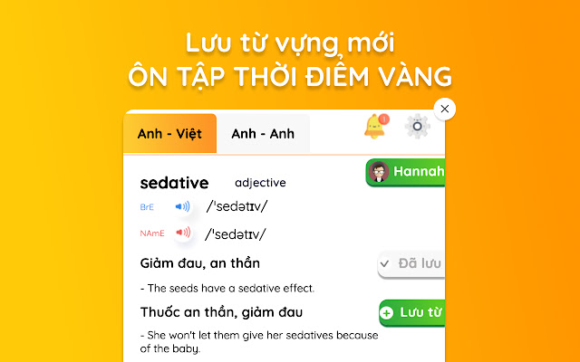 无需打开新标签页,在 1 条笔记中查找字典。包括英语 - 越南语、英语 - 英语词典以及发音和视觉示例。