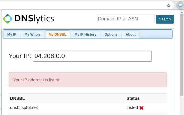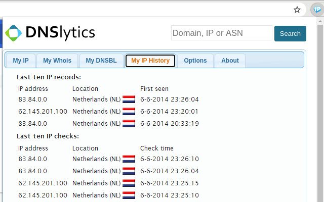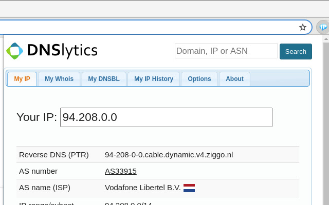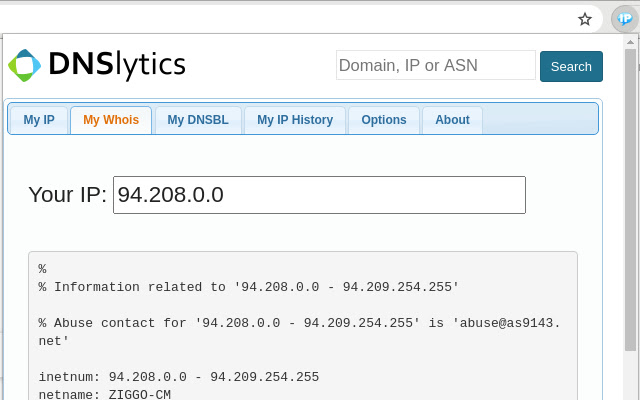 此扩展显示有关您的 IP 地址、 域名和 ISP 的详细的信息。例如 ISP 名称、 位置、 ISP、 DNS、 whois、 路由、 承载、 域的邻居、 DNSBL、 BGP 和 ASN 的信息。