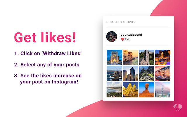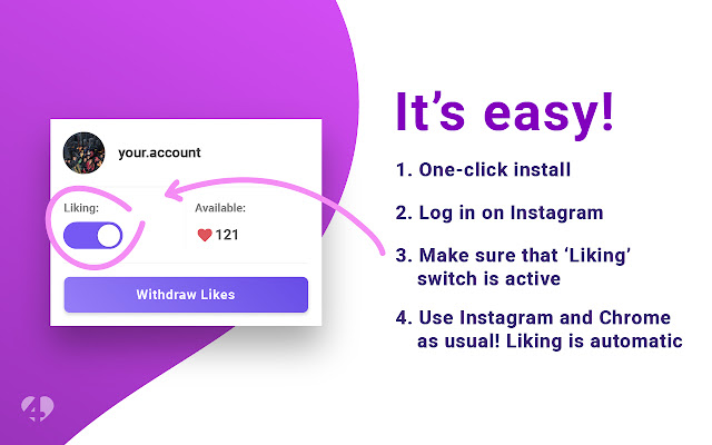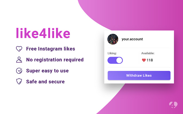 这是对 like4like.com 的补充。对于不想使用 Instagram 帐户详细信息在我们的网站上注册的用户来说,这是一种安全的选择。此扩展程序不需要您输入敏感信息。它也可以在任何 Chrome 浏览器上轻松访问。