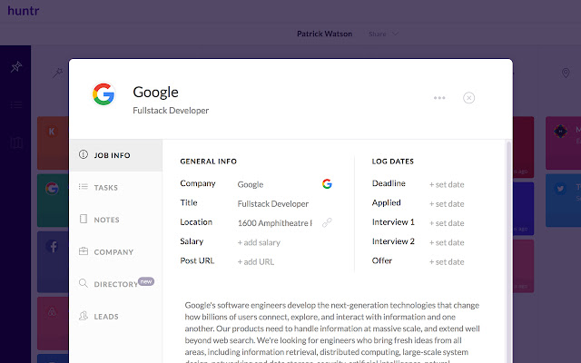 从整个网络收集、跟踪和管理您的工作申请。 Huntr 的 chrome 小部件可帮助人们密切关注有关他们求职和机会的每一个细节,无论他们在哪里找到。记录笔记、日期、任务、描述、薪水、地点、公司数据等。