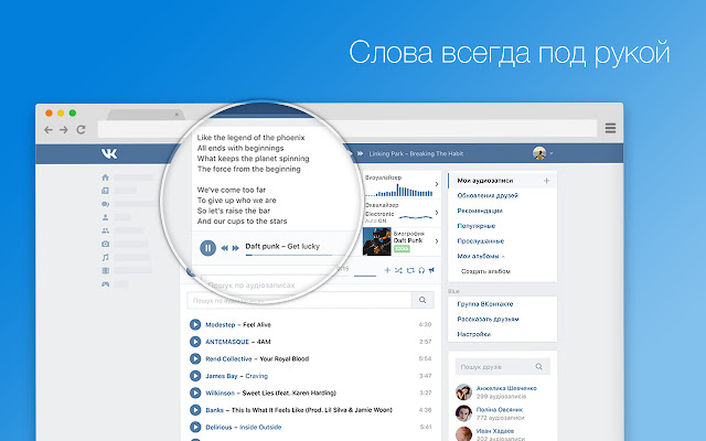 标准 VK 播放器 (vk.com) 的扩展。均衡器、Last.fm、媒体键控制、艺术家传记和歌词。