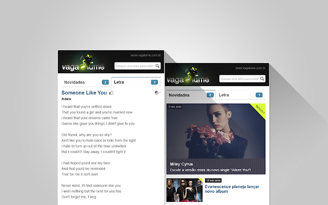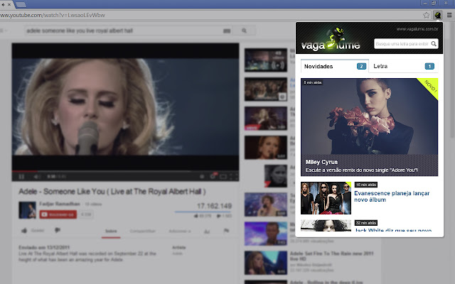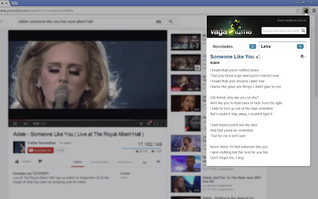 现在,您不必花时间查找有关歌曲的歌词和其他信息。只需点击 Chrome 中的 Vagalume 图标,它就会自动显示页面上自动识别的歌词。