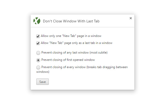 当最后一个窗口的最后一个选项卡关闭(或每个窗口,它是可配置的)时,此扩展程序会保留一个固定页面以防止关闭 Chrome。为了保持标签栏干净(与其他扩展不同),只有在绝对必要时才插入固定页面。它还可以很好地处理选项卡在窗口之间移动时的情况。