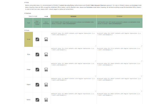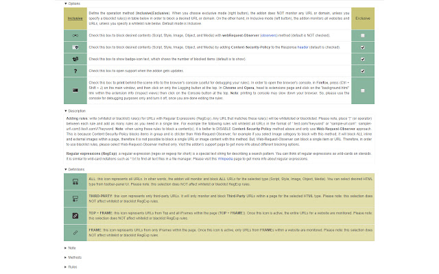 f) 从选项页面中选择所需的阻止引擎、Web-Request-Observer 或 Content-Security-Policy。