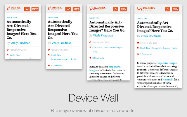 * 设备墙:设备大小视口的鸟瞰图。在这种模式下,每个视图都根据页面的 标签进行缩放,并使用真实设备值覆盖 User-Agent。