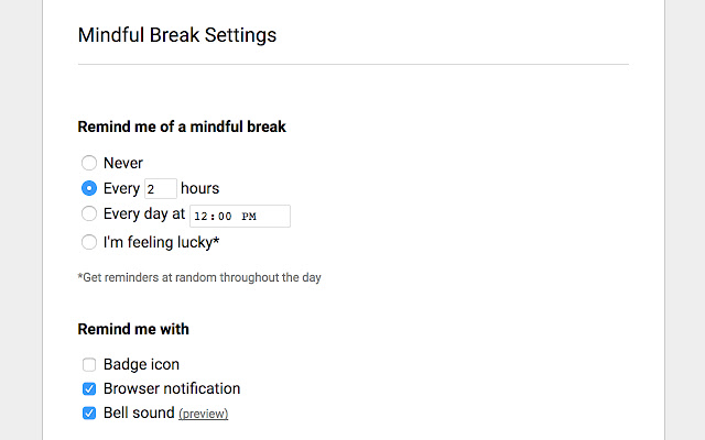 需要休息吗? Mindful Break Chrome 扩展程序为您提供正念提示并指导您进行短暂的呼吸练习。设置提醒以帮助您记住。全屏显示以帮助您保持专注。