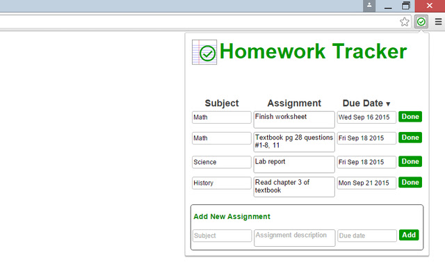 Homework Tracker 是一个待办事项列表扩展程序,可帮助您记住到期日期的到来。直接从您的浏览器添加到您的列表或编辑现有作业,而无需离开您当前的网页。